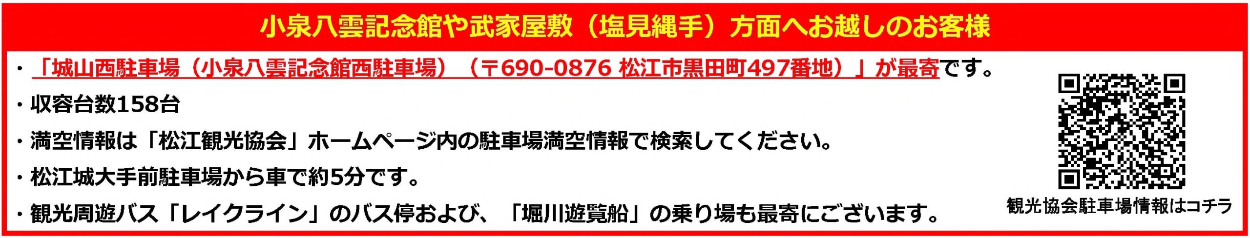 城山西駐車場 (小泉八雲記念館西駐車場) 0852-60-1119(9:00~17:45)